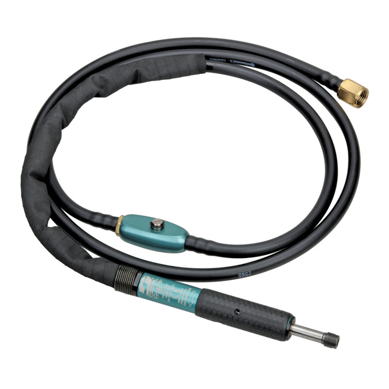 High-Quality Air Line; 1/4" (6 mm) in diameter and 5 feet (1.5 m) in length. Over-hose Assembly; Helps direct air and excess oil away from operator - 12" (305 mm) in length. Variable Speed Flow Control; Adjust your desired speed with dial, up to 60,000 RPM. Unlike roll valves, your speed stays set when turning tool off and on. One Touch Starts Tool at Desired Speed; Handy push-button for simple on/off operation. Tool comes on at same speed as when you shut it off!